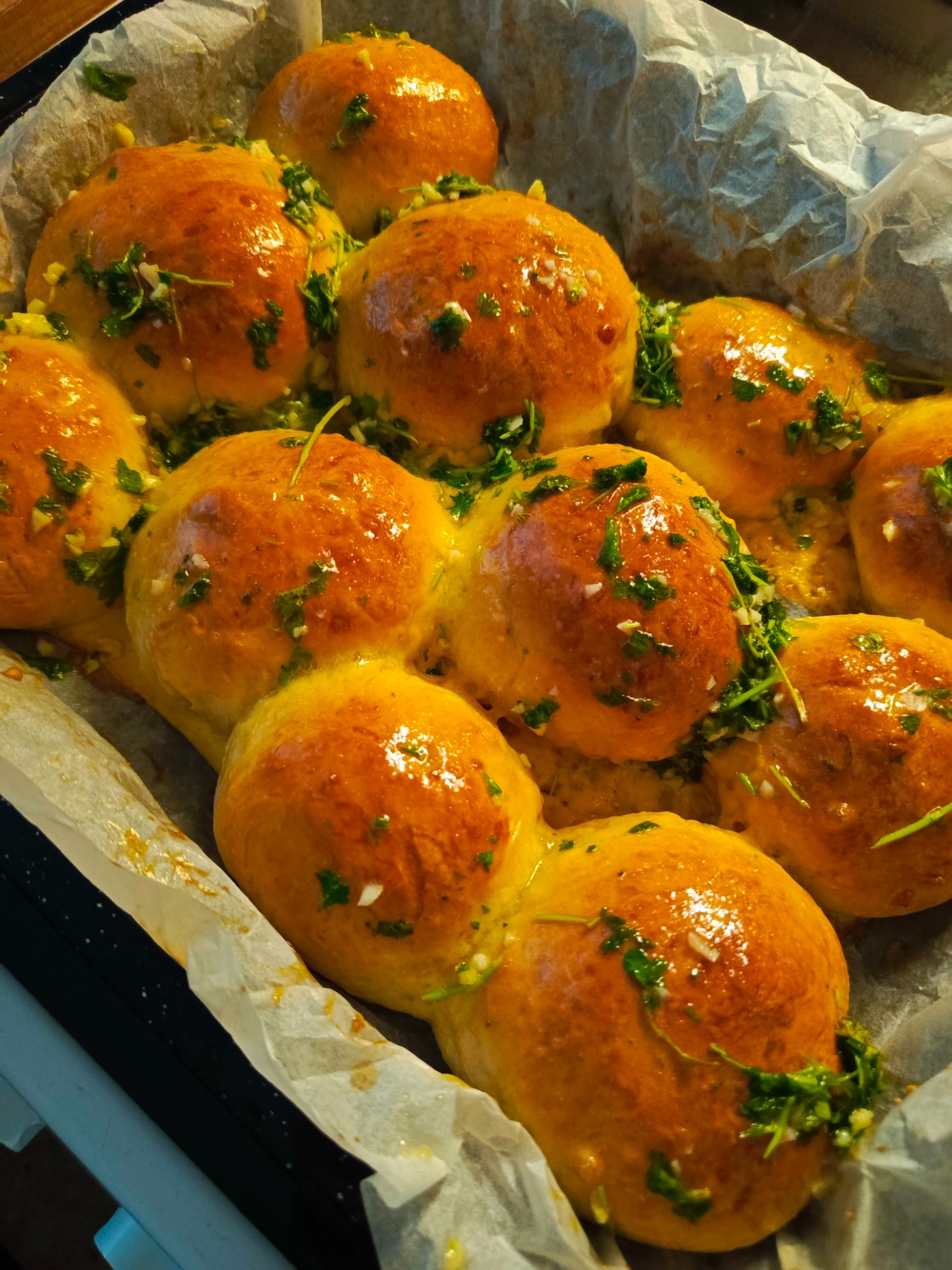 - Připravíme si rozehřáté máslo, prolisujeme do něj oloupaný česnek a nakrájíme najemno petrželku