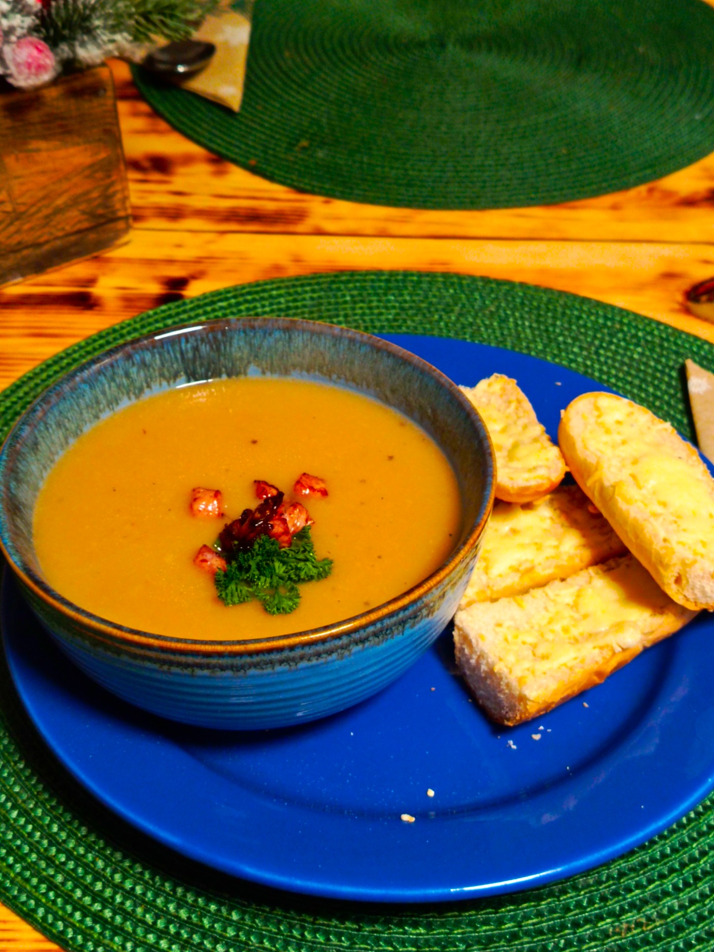 Hotovou polévku dozdobíme uzeným a orestovanou cibulkou, ve Francii bagety zapíchnou do polévky, u nás je k polévce zakusujeme, ale to už necháme na vás