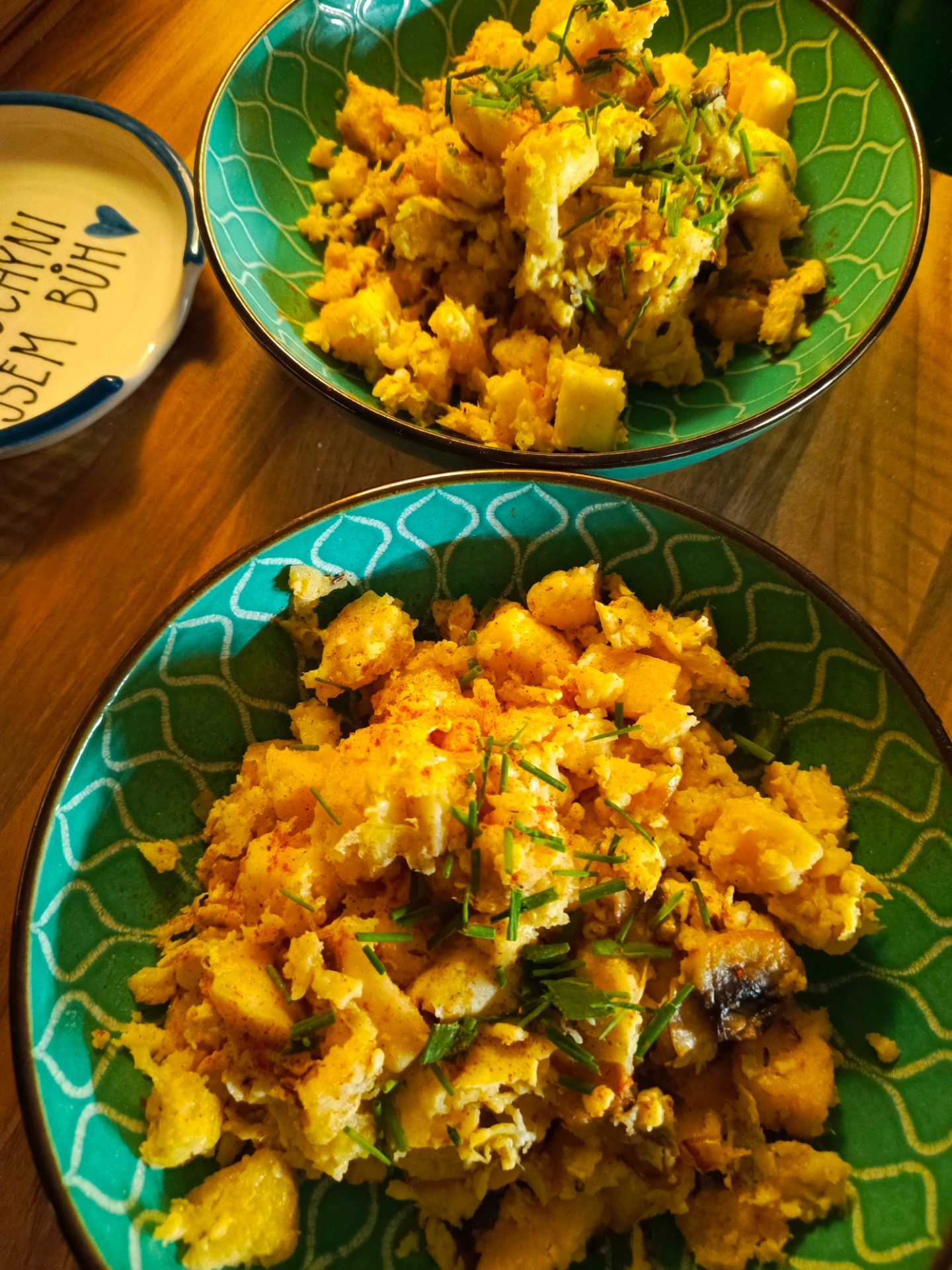 - Až nyní přidáme knedlík. Jeho opečením jsme vytvořili kůrku a nebude nám tak vajíčka pít, a mícháme