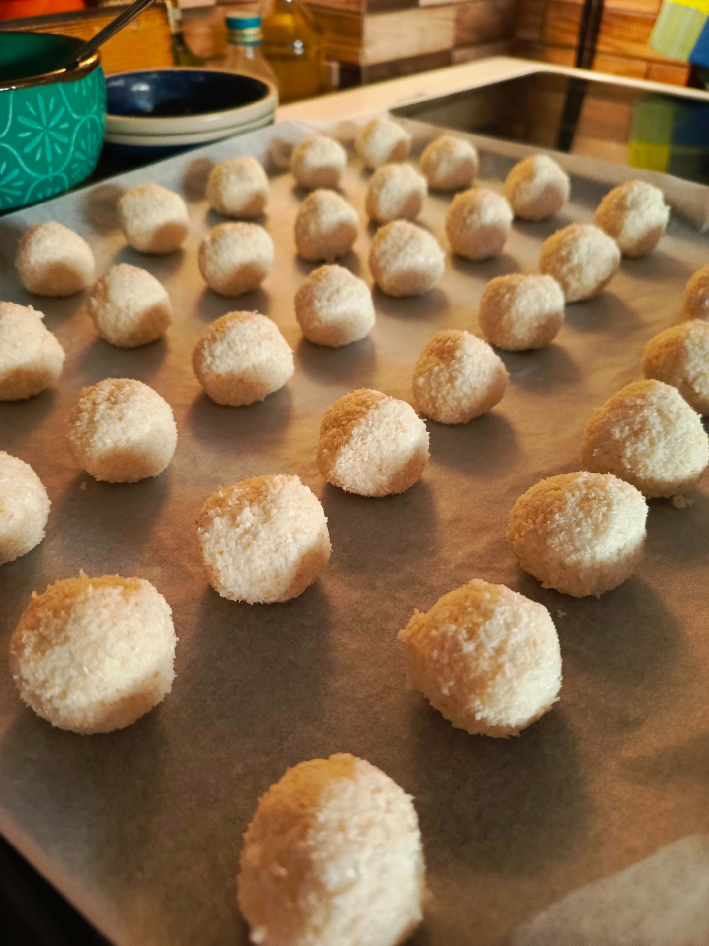 Plech si vyložíme pečícím papírem, na který pokládáme kousky vzniklého těsta - to vykrajujeme buď lžičkou, nebo rukama tvoříme kuličky