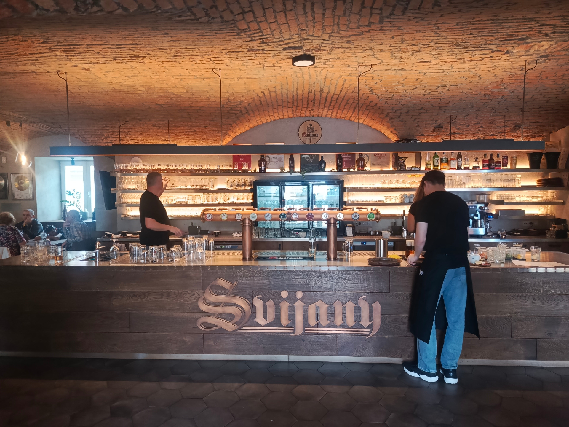 Restaurace v pivovaru je vyhlášená široko daleko a když říkáme daleko, tak opravdu daleko. Například v severočeských Teplicích je kuchyně velice dobře známa a nejen tam. Takže musíme jet na zkušenou. Neustále plné stoly, kdy na usazení musíte chvilku čekat, dávají tušit, že se zde bude vařit dobře. Recenze i nespočet vzkazů, visejících u vchodu, to jen potvrzují. S ohledem na prostornou restauraci a předzahrádku, se nečeká déle, než pár minut. Usedáme a hned se dáváme do ochutnávky nealko Yuzu s bergamotem (již manželka praxi má a moc jí chutná), zatímco já vyzkouším nealko Vozku. Jak to tak u Svijanského piva mám, první zahučí a druhé už tak dobré není. Ale to nic proti zlatavému moku a jeho vyznavačům. Jídelní lístek nabízí cca do dvaceti různých jídel, s možností poloviční porce pro děti a jde převážně o jídla české kuchyně. Jdeme do čerstvých těstovin s králičím masem, sušenými rajčaty, bylinkovým pestem a sýrem Pecorino, zatímco já nemohu odolat babiččinu kuřátku s nádivkou z kopřiv a žemle a bramborovými plackami. Při množství jídel, valících se z kuchyně chápeme, že na stole nemáme plné talíře, jako v nějaké závodce. I na množství turistů a strávníků, kteří se zde co chvíli prostřídají, je restaurace čistá, prostorná, vzdušná a přesto útulná. Ceny jídel se pohybují od dvou do tří set, což je rachot, ale poté, co nám přinesli na stůl, vůbec nelitujeme. Porce jsou naprosto dostatečné, jídlo krásné a chuťově naprostý majstrštyk. Takhle skvělé jídlo jsme již dlouho neochutnali a všem těm slovům chvály musíme dát jednoznačně za pravdu. Jo jasně, pokud jste jako pipina od vedlejšího stolu, co má na ruce kérku a v hlavě lej**, co nejí česnek, cibule jí dráždí v krku, maso může jen jednou týdně, knedlíky jsou hutný a kuře měla včera přeci, tak raději seďte doma a neserte okolí. Protože tady, tady jde o gurmánský zážitek a nejste-li ho hodni, ani sem nejezděte. Vstup je možný i s psíčkem a restaurace je bezbariérová. Jediné mínus je WC, které je v mezipatře pod restaurací a to již hendikepovaným přístupné není. Takže jedna mínus a víte co?