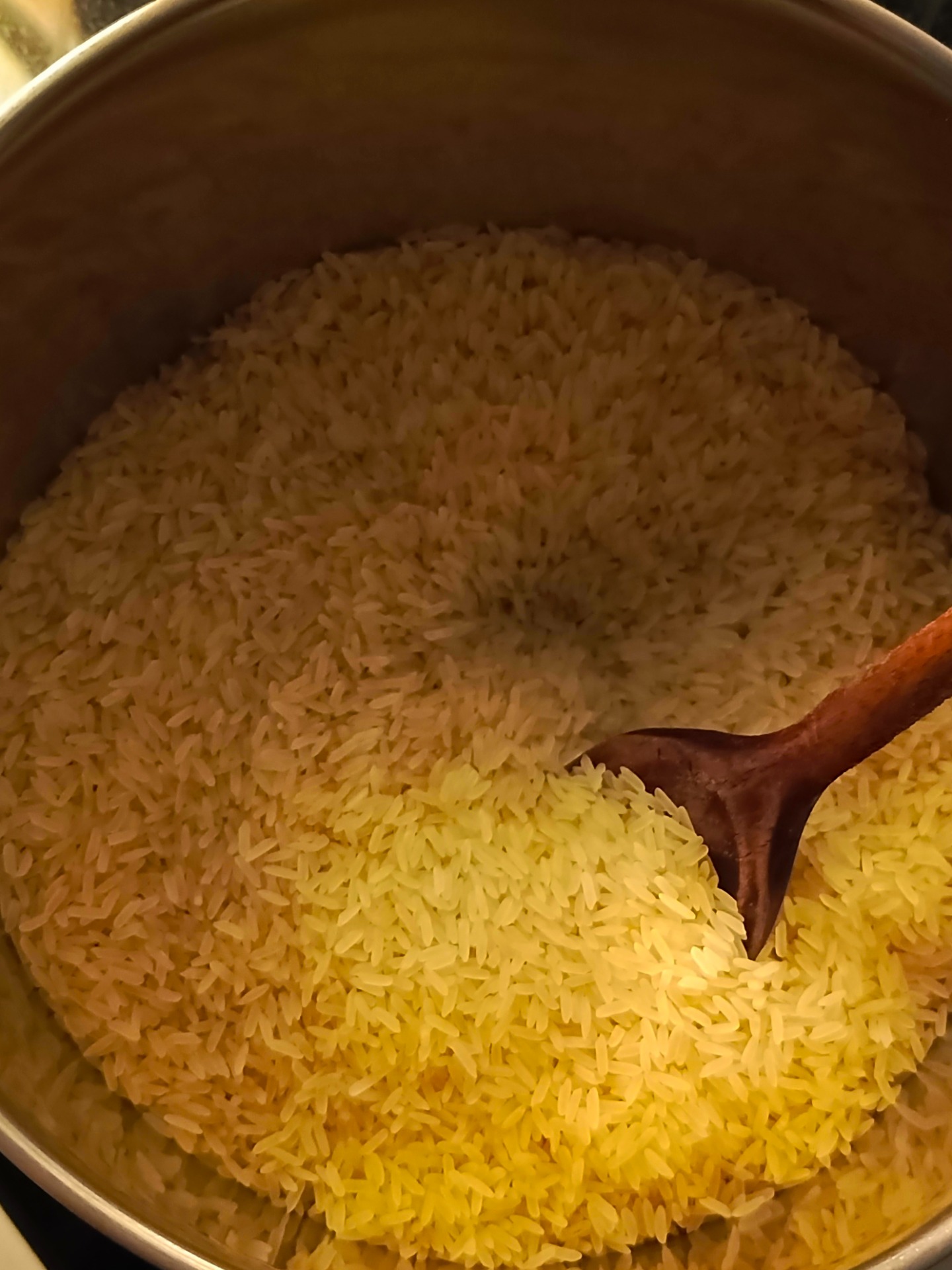 Do kovovejce dáme koření a cibuli a dáme do vody k rýži