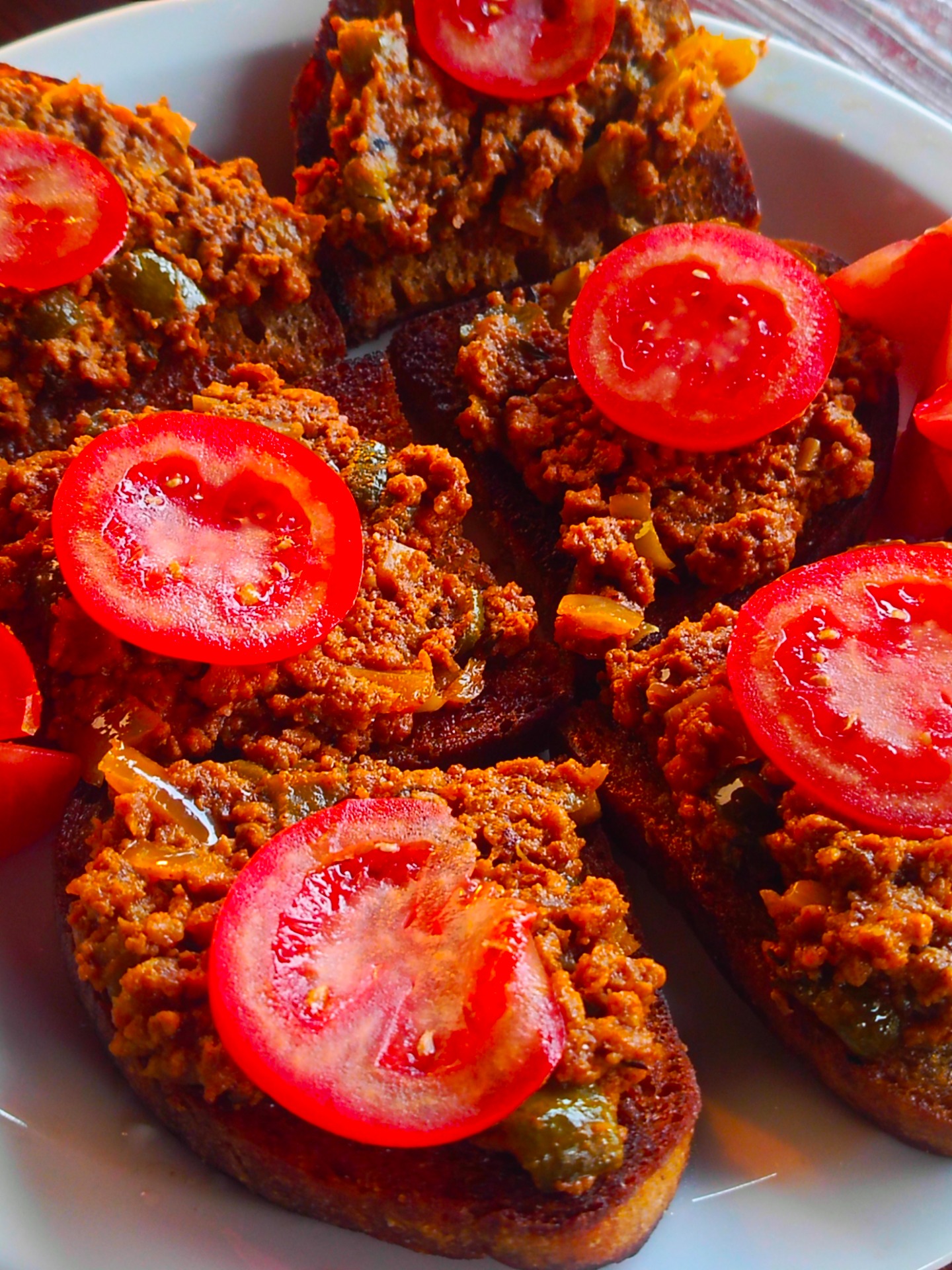 - Mezitím si na suché pánvi vedle připravím topinky, které budu ke směsi podávat. K topinkám přidejte česnek na potření a je vymalováno.